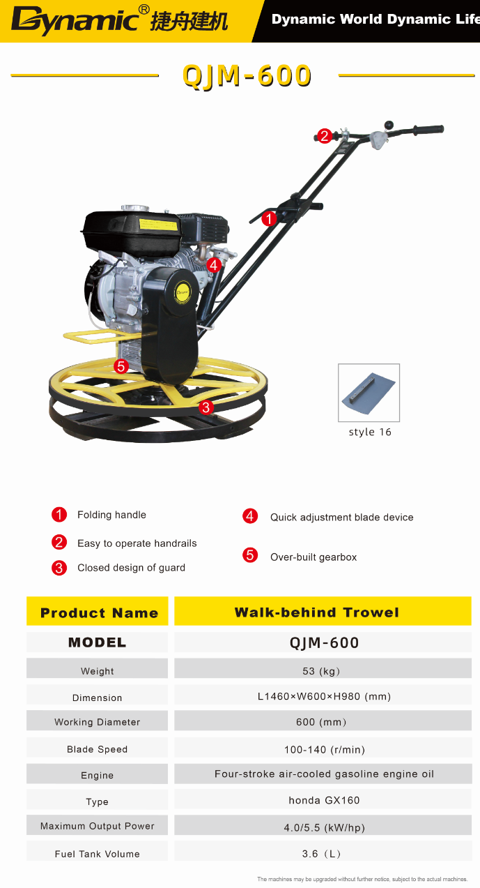 Introduction:Our walk-behind trowel series offers a variety of specifications with working diameters ranging from 600mm to 1200mm. They offer flexible operation, efficient construction, and easy maintenance, making them suitable for finishing and slurrying on various concrete floors